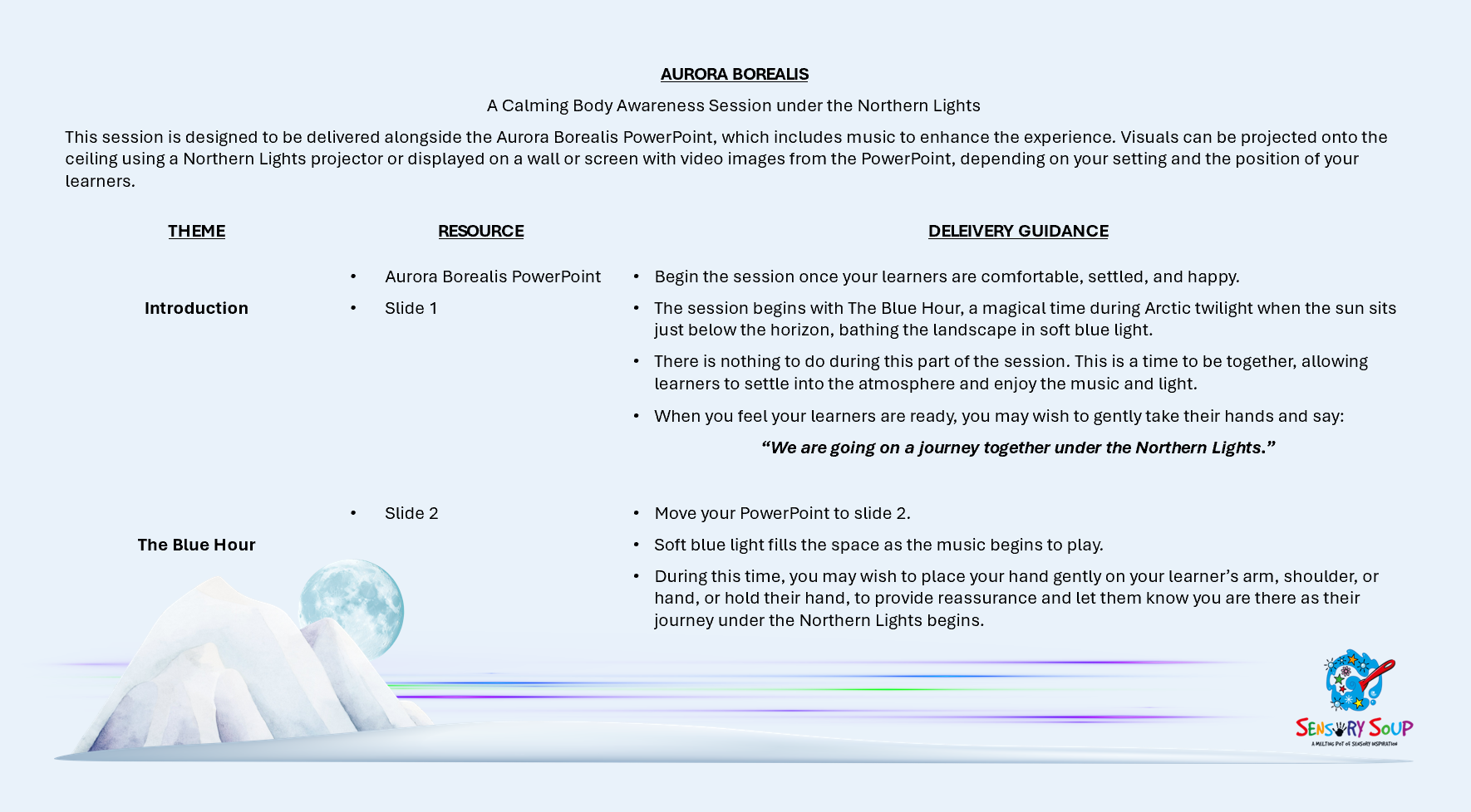The accompanying PowerPoint/video provides the music and visual support for the session. It can be shared flexibly to suit your space and learners, with the option to enhance the experience using a Northern Lights projector.